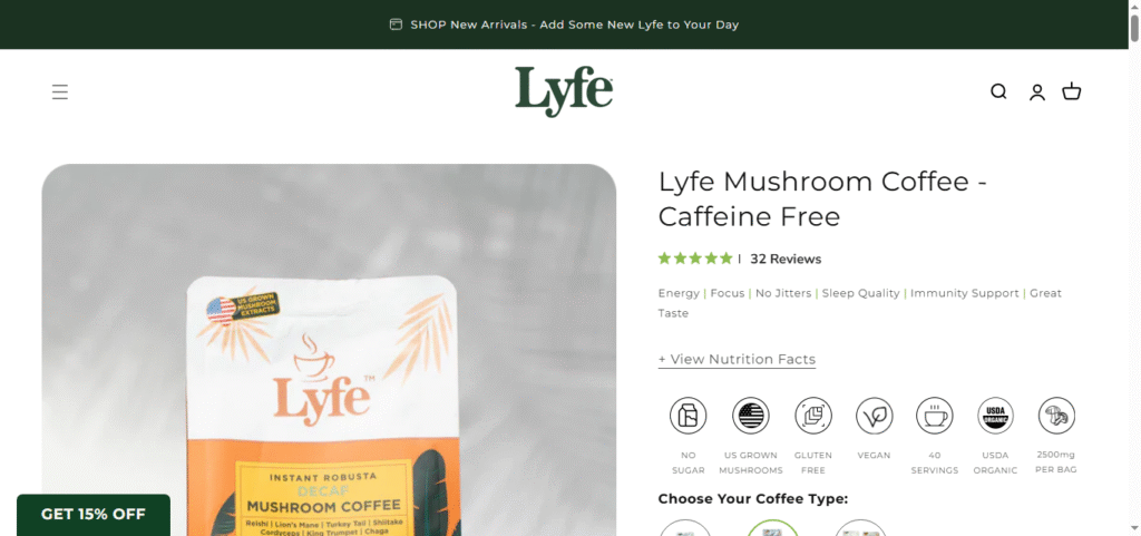 uilt a modern Shopify store for Lyfe Brew’s caffeine-free mushroom coffee. Emphasized clean design, informative product pages, and smooth shopping experience to increase customer engagement.