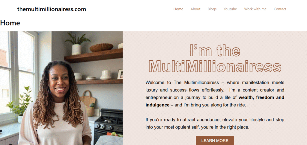 A bold and inspiring website showcasing The Multimillionairess brand and offerings with strong visual branding and messaging.